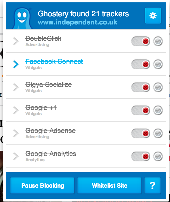 Kuva 2. Ghostery Finding Panel sivustolla independent.co.uk
