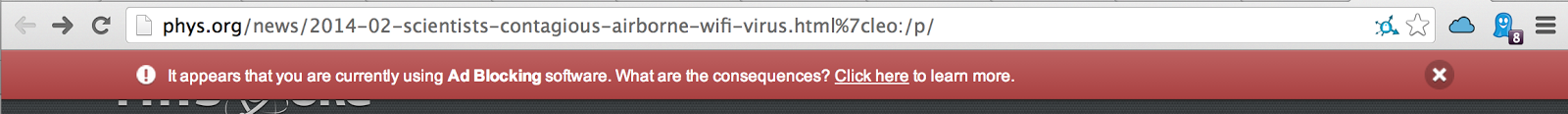 Osa sivustoista pyrkiikin kertomaan käyttäjälle, että sivuston käytettävyys ja mahdollisesti myös sivuston ylläpitäjien mahdollisuudet tarjota palvelua tulevaisuudessa voivat heikentyä esto-ohjelmien takia. Esimerkiksi phys.org -sivusto näyttää sivuston käyttäjälle informaatiopalkkia (kuva 3), jonka kautta tarjotaan isätietoja mainonnan estämisen seurauksista. Lisätiedoissa kerrotaan että mainosten estäminen heikentää mahdollisuuksia tarjota phys.org-palvelua. Käyttäjää pyydetään joko ohittamaan estot phys.org-sivustolla, rekisteröitymään sivuston käyttäjäksi tai antamaan sivuston ylläpitäjille lahjoitus, jonka avulla mainoksista voitaisiin luopua. [5]